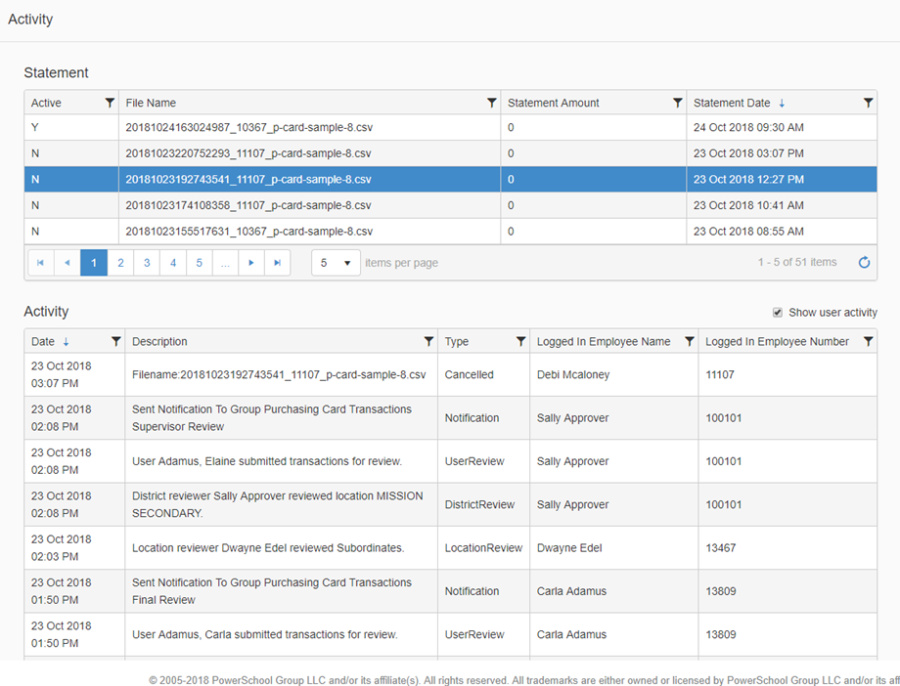 The Activity page provides users with a way to view the activity associated to the current active statement file, or statements previously uploaded. Access to the Activity page is controlled by your Role permission.