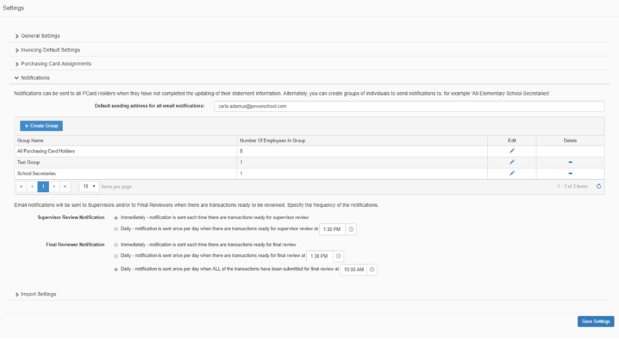 The Notifications section is where you add/edit/delete notification groups, and where you specify the frequency of notifications to be sent to Supervisors and Final Reviewers.