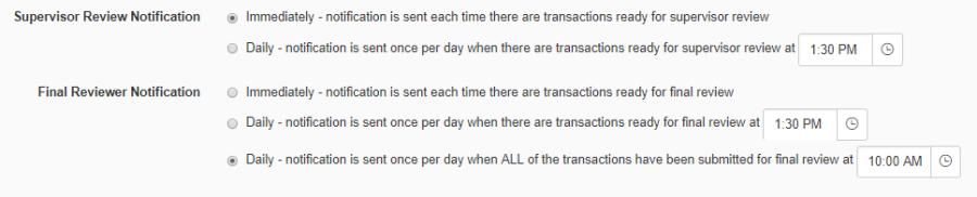 Supervisors and Final Reviewers may not want to receive email notifications each time that purchasing card transactions are ready for their review. Notification frequency options include: