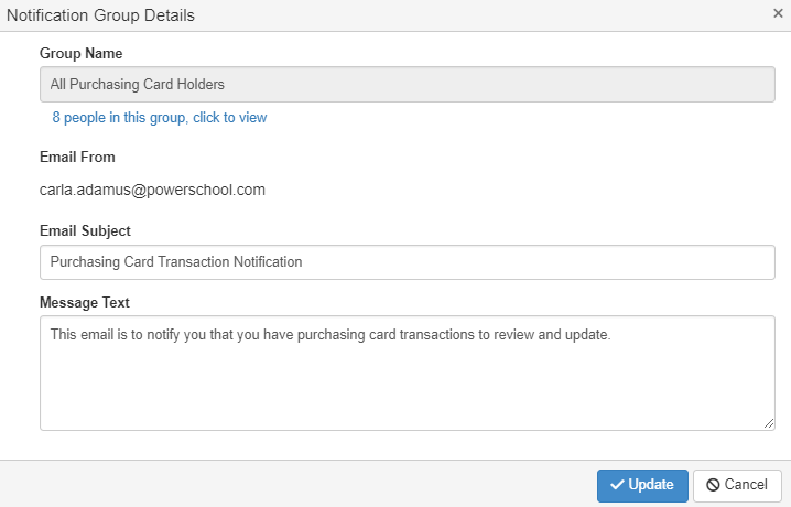 By default, there is one system defined group called 'All Purchasing Card Holders'. This group includes all employees across the district who have a purchasing card assignment. This group cannot be deleted, but you can modify the message text for email notifications for this group.