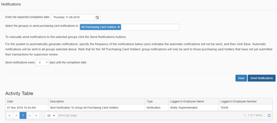 If you would like the system to automatically send out reminder email notifications to those employees that have not yet reviewed and submitted their transactions, then enter the interval for the automatic notifications, for example every '1' day until the completion date as previously defined, and then click Save.