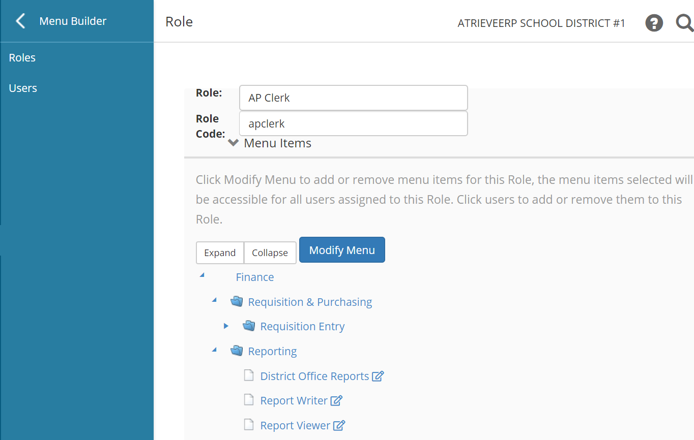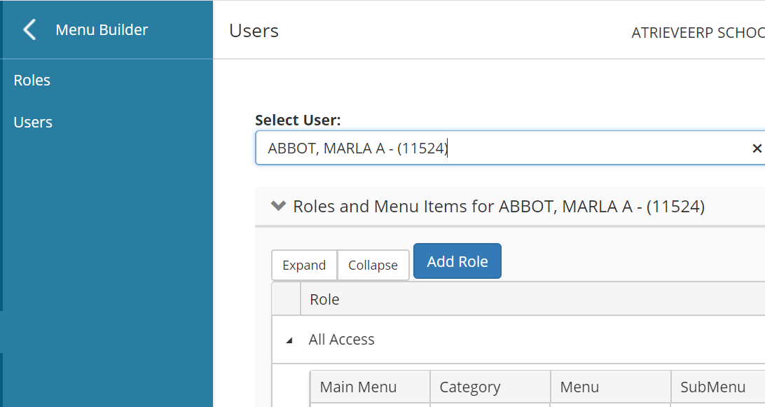 To update the role, click Roles from the left-hand Menu Builder Menu
