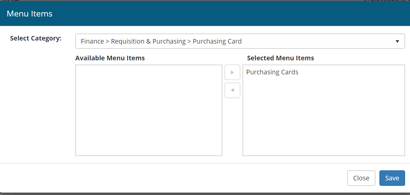 Once selected, it will show you any options available for Purchasing Cards. Click on Purchasing Cards to select it and click on the arrow to move it into the "Selected Menu Items" list so it will be added to this roles menu.