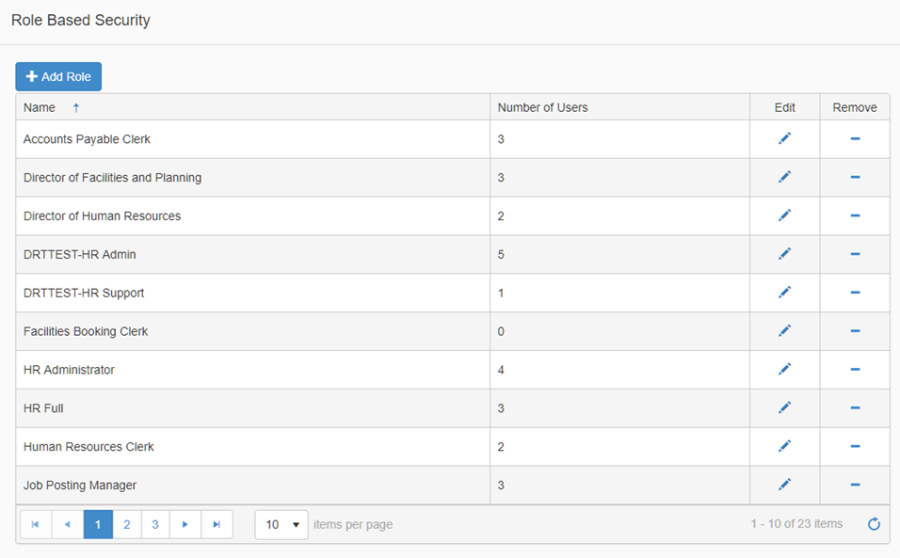 Navigate to Role Based Security, the Roles List page displays a listing of all roles that have been created within the district. Select an existing role to update or click Add Role to create a new role. For this document a new Role will be created.
