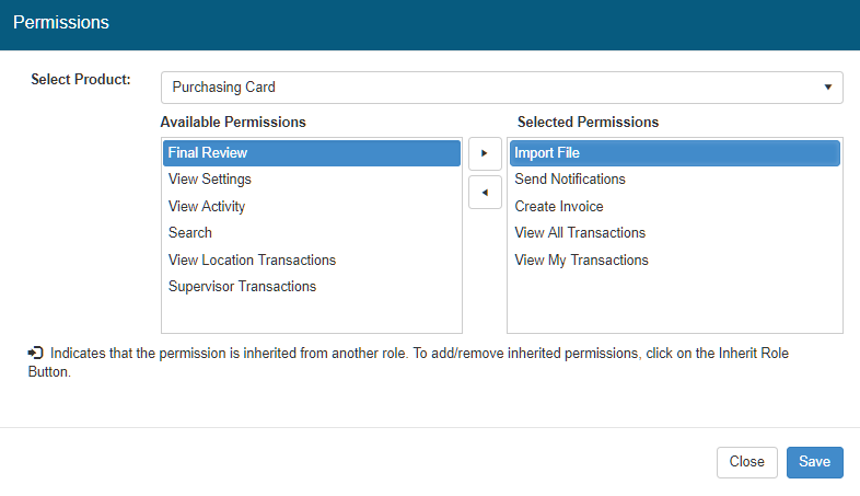 Select Purchasing Card from the product list, and the list of available permissions will display in the list mover