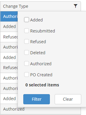 The Change Type column filter, includes a list of the possible change types, where you can select one or more to further filter the table information