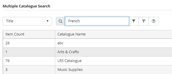 Search filter dropdown - clicking on the dropdown will display a list of possible search filters. By default the selected filter is by Title. Selecting a search filter and then entering a keyword and clicking the enter key on the keyboard will filter the data and display the search results in the grid. Note that the options that display in the search filter list are dependent on the catalogue type (LRS or Other).