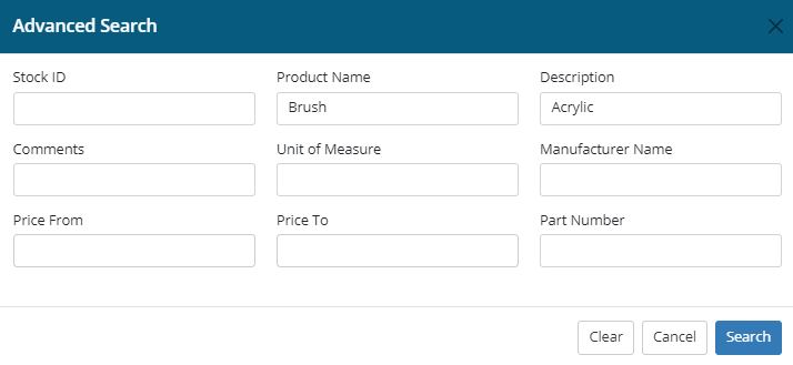 Clear button - The Clear button when selected will clear data from all fields within the search popup