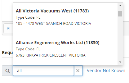When you need to create a requisition for items not associated to an uploaded catalogue, if the vendor is known, type a portion of the vendor name and the dropdown list will filter to display a list of matching vendors. To help select the right vendor, additional information is displayed including the vendor number, type code, and vendor address.