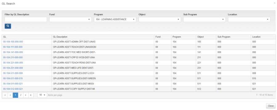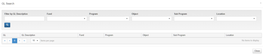 Enter or select a value and then click the search icon, and the results of the search are displayed. Click on a GL link to select it and the search window will close, and the grid row will be updated with your selection.