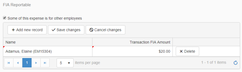 FIA Reportable (Freedom of Information Act) - If any portion of the expense is for other employees, click the check box and then click Add New Record in the grid. Enter the employee name(s) and the expense amount(s).