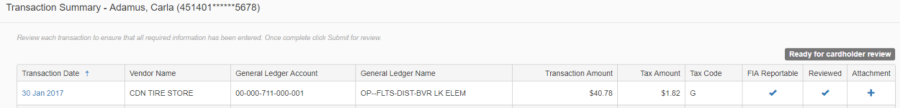 Click Submit for Supervisor Review, the Transaction Summary grid will be updated with a visual indicator (check mark) that indicates that the employee has reviewed the transaction record.