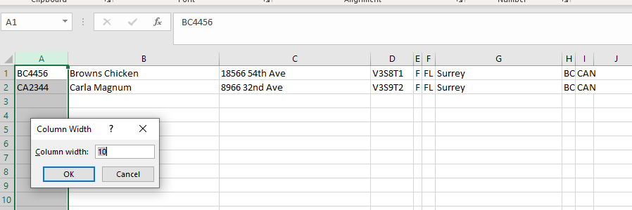 Example: Column A (Vendor Number) = Width 10, Column B (Vendor Name) = Width 30, etc.