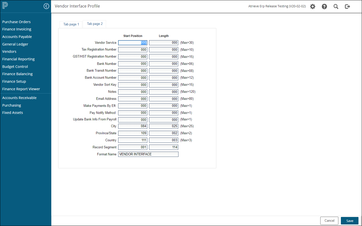 - Each field requires the entry of a start position and the length of field found in the external file to be interfaced to the system. The 'MAX' fields show the maximum length of field used by the system.