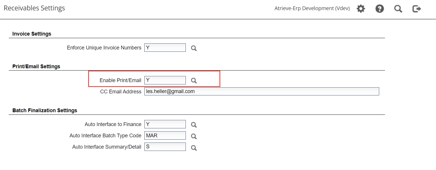 When Print/Email is set to “Y” in the Receivables Setting, a new button “Print/Email” will be displayed