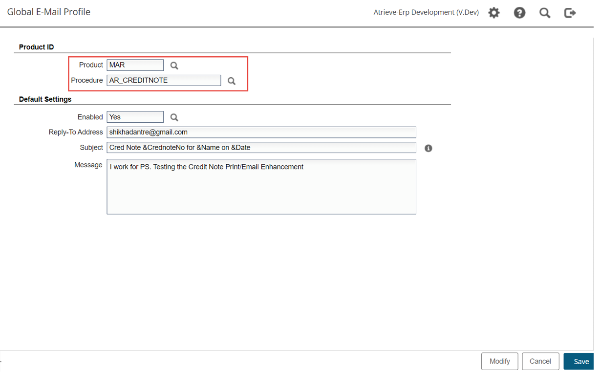 Functionality added to email Accounts Receivable credit notes directly to customers. Previously the finance clerk would need to do an inquiry on the credit note and then output to pdf format to be able to send to the customer through mail or email.
