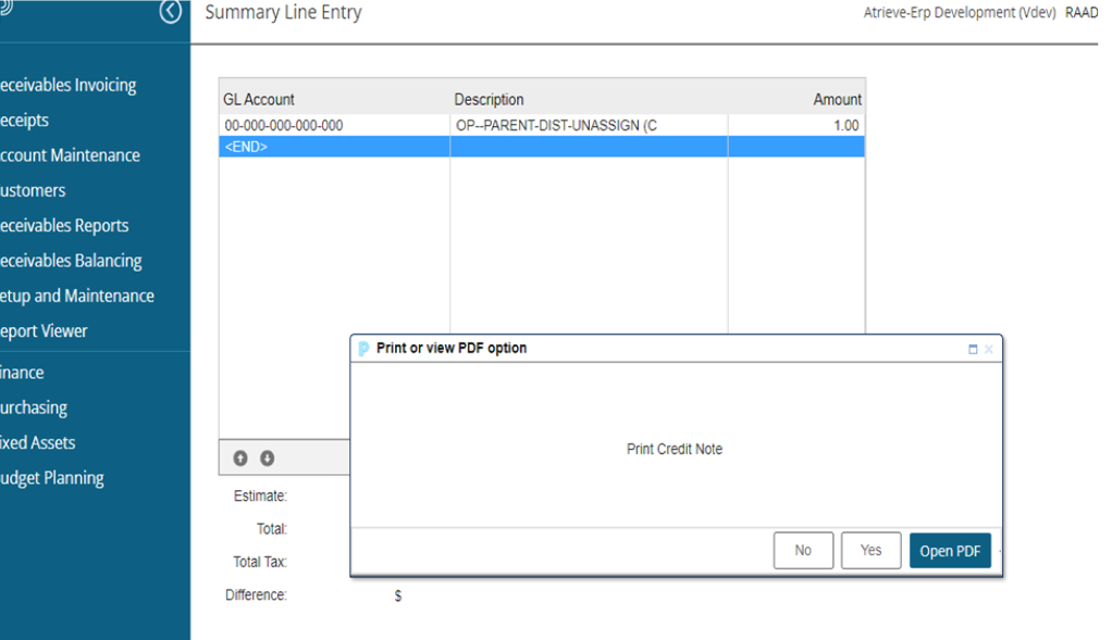 Upon selecting Save - existing Print Credit Note will be displayed along with a dialog, with options Yes, No and Open PDF