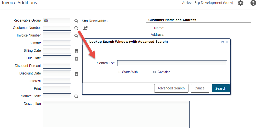 In Accounts Receivable, when performing a customer lookup, users will see the customer name lookup (with additional advanced search button) instead of being shown the full customer listing, which would require users to scroll through (or use Ctrl+F to bring up the search).