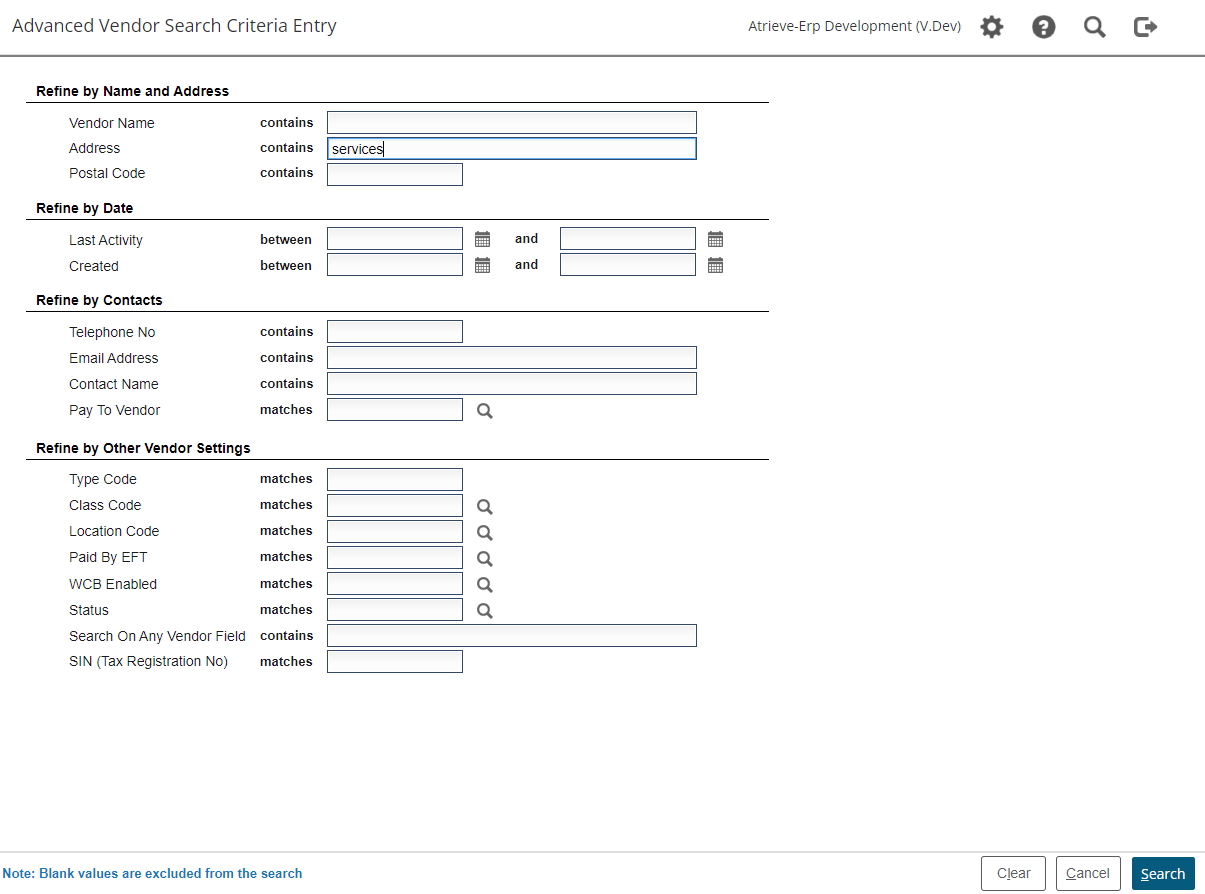Being able to find a vendor or customer by additional criteria other than name saves users time searching through the vendor/customer listing or from having to run reports to find the vendor they’re looking for. The advanced search helps users select the correct vendors, especially if there are many with the same name or have used address as overflow for long names.
