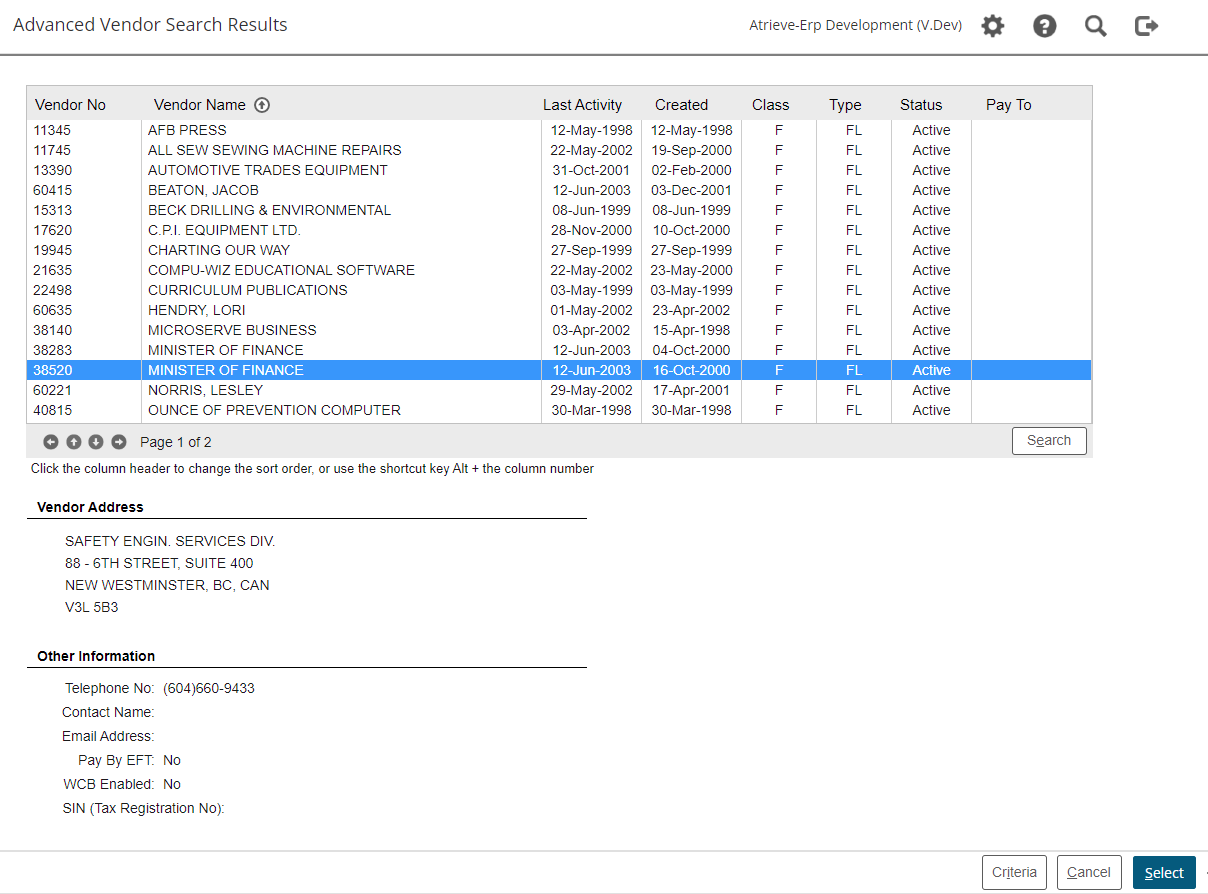 The new advanced vendor/customer search results grid allows users to sort the resulting values by clicking column headers.