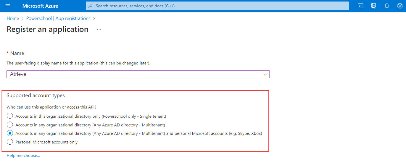 Specify who can use the application, sometimes called its sign-in audience. Select Accounts in any organizational directory (Any Azure AD directory - Multitenant) and personal Microsoft accounts (e.g. skype, Xbox).