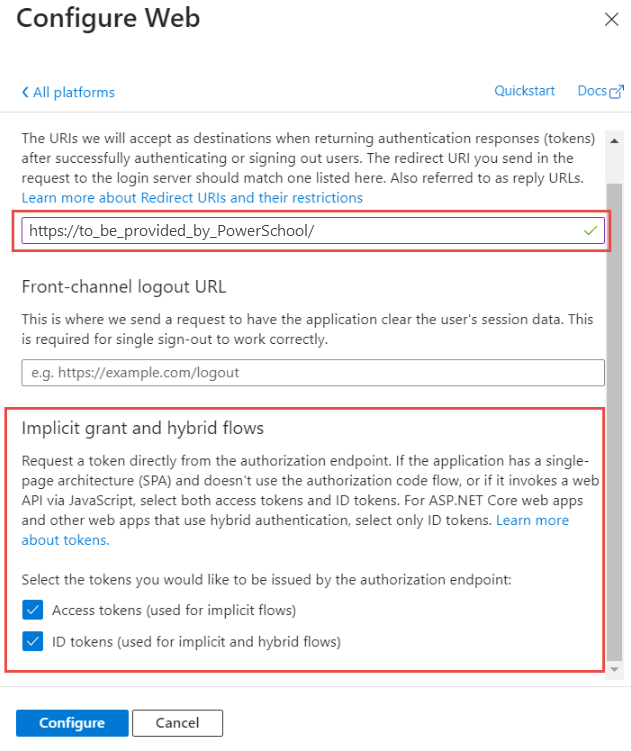 On the Configure web panel, enter the URI provided by PowerSchool in the Redirect URI field, and then navigate to the Implicit grant and hybrid flows section to check the checkboxes;