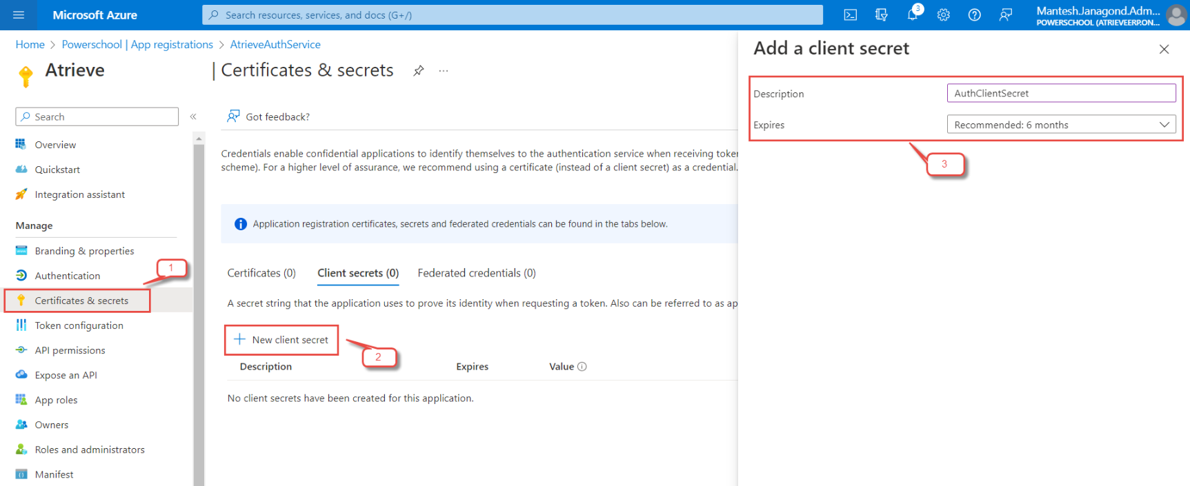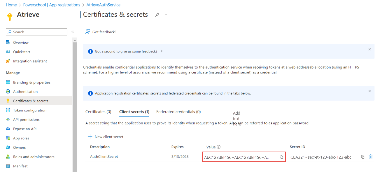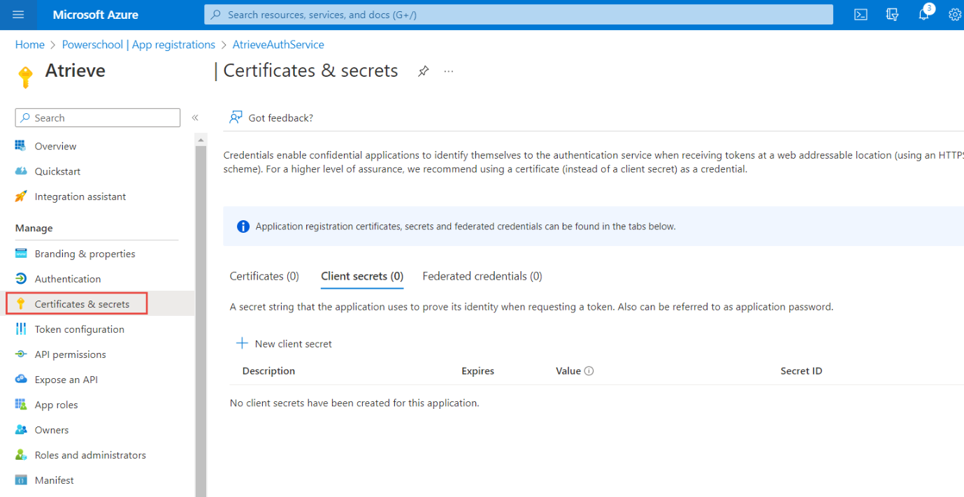 When the Client Secret expires, a new one has to be generated by your division and provided to PowerSchool to re-enable logins to Atrieve. PowerSchool does not have access to your Azure instance and therefore cannot monitor your division’s expiry date. It is your division’s responsibility to provide a new secret in advance of expiry to ensure user access is not disabled.