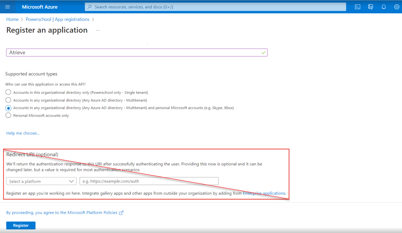 Do not enter any values for Redirect URI (optional). You will configure a redirect URI in the next section of instructions.