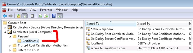 In the console tree, expand Certificates - Service (Active Directory Domain Services), expand Personal, and then expand