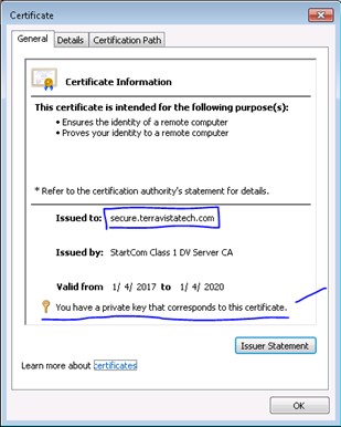 When done correctly, your certificate will have the external DNS name in the “Issued to:” field, and there will be a message indicating “You have a private key that corresponds to this certificate”.