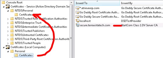 4. Once you have the certificate in the Computer Account personal store, it needs to be copied over into the Active Directory Domain Service personal store:
