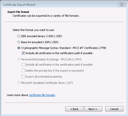 Choose .p7b format with “Include all certificates in the certification path if possible"