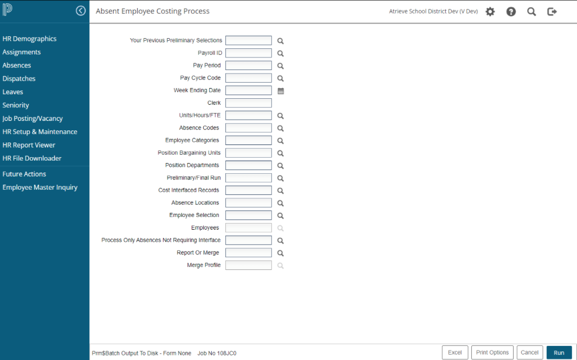 To run the Absent Employee Costing Process to Excel, click the Excel button once the report prompts have been completed or anytime to accept all process defaults and run to Excel.