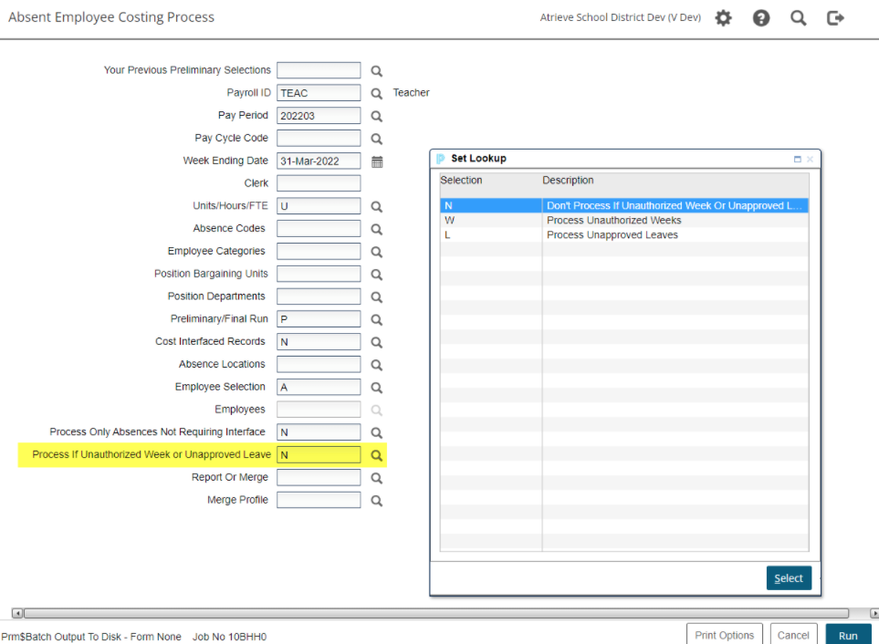 L = Process Unapproved Leaves. This option only allows the user to run costing in preliminary mode. This is only relevant to absences that require leave approval as described above.