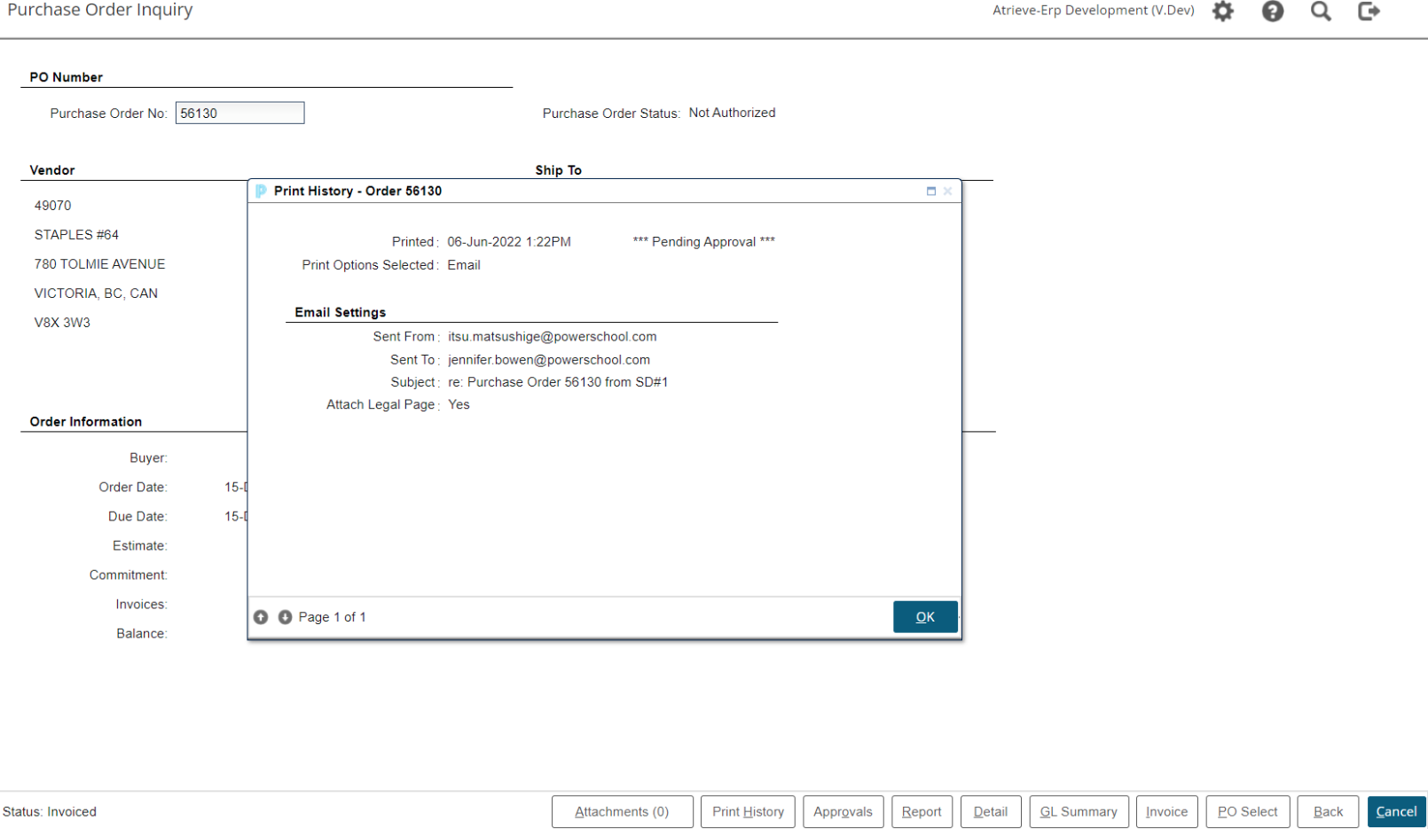 A ‘History’ button has been added to Purchase Order Inquiry to allow finance users to check the history of when a purchase order was emailed and the details associated with that email.