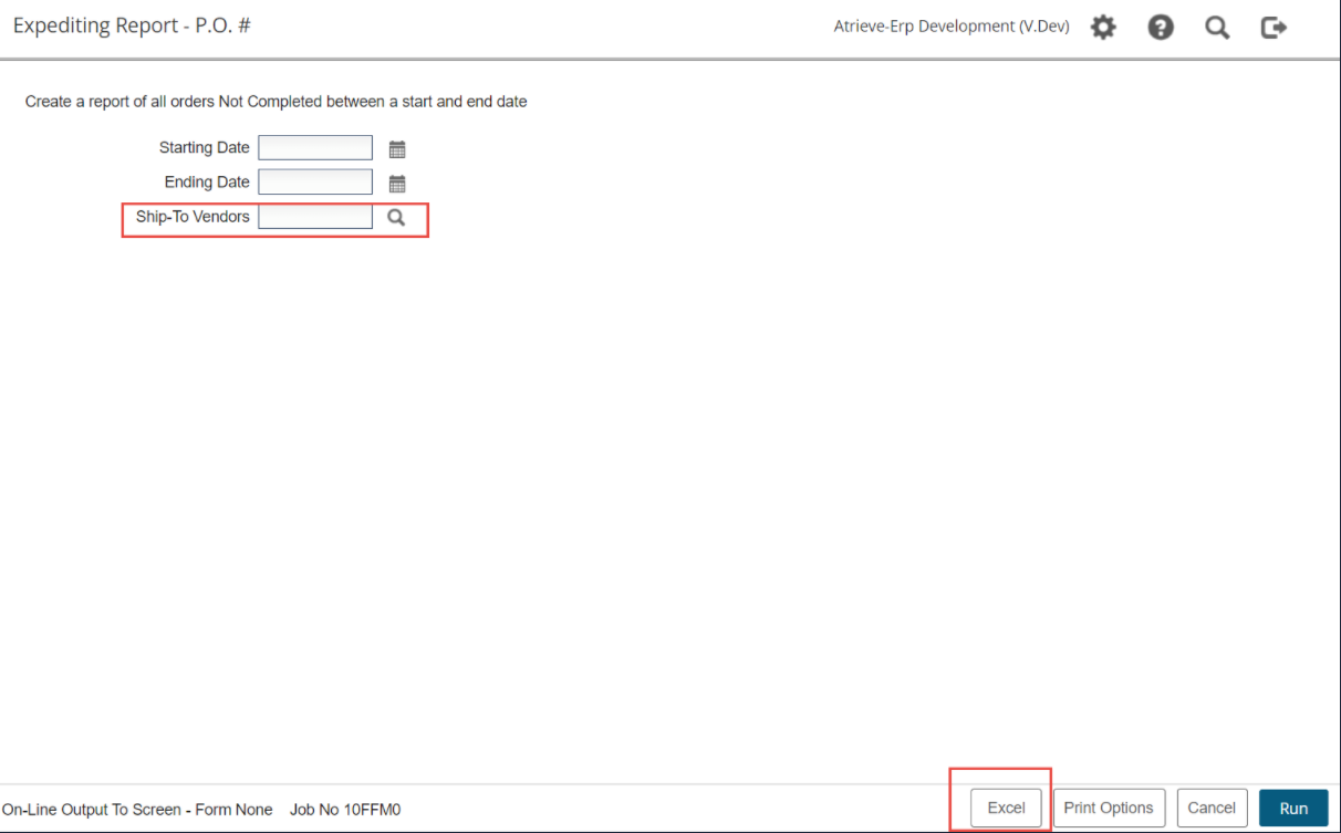 Excel export will have the same data as the report, plus columns Order Line No, Vendor Name, Ship To Vendor, and Ship To Name. In addition, the report has been enhanced with the ability to select specific Ship To Vendors to report on.