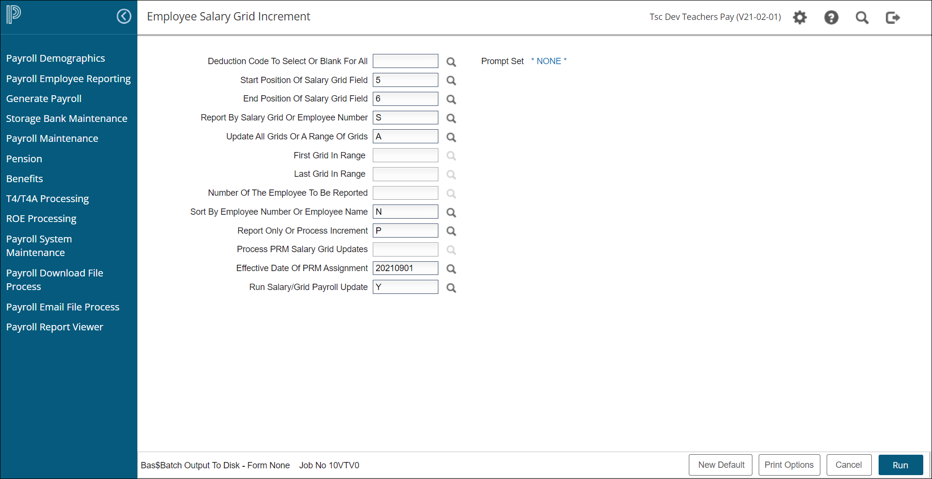 The Run Salary/Grid Payroll Update field will be activated when the Employee Salary Grid Increment process is run in Process mode and will not be activated when run in Report mode.