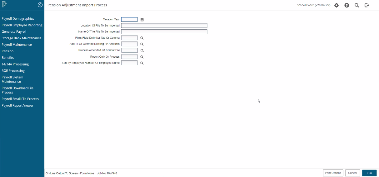 Navigate to Payroll > T4/T4A Processing > T4/T4A Pension Adjustment > Pension Adjustment Import Process