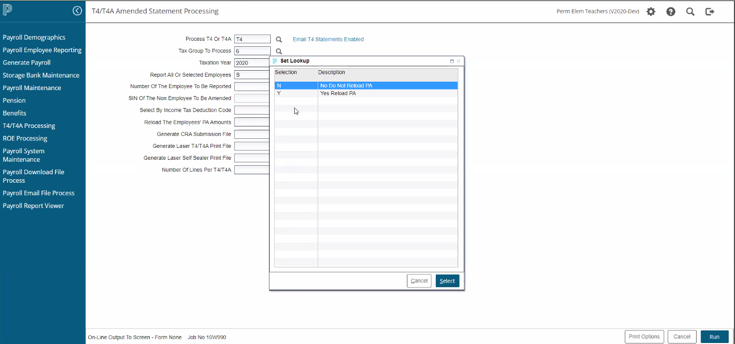 The T4 Amended Statement process has been updated so that anytime that you need to reissue an amended T4 you can choose to include the new pension adjustment amount. This is equivalent to the current process in Statement Maintenance where you would update an employees adjustment amount manually, except that with this new process you may update multiple employees, all at one time.