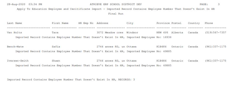 After the exceptions, users will see the regular report which will show you what was in the import file, and what was imported. The imported data will show up first, following by data to be imported into Atrieve HR.