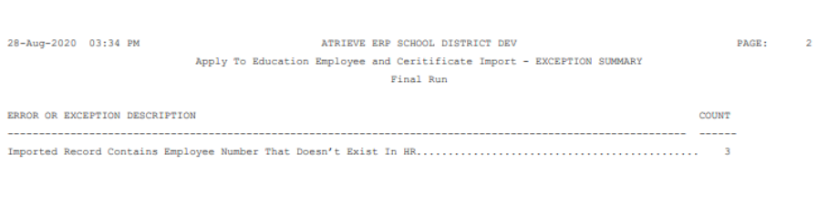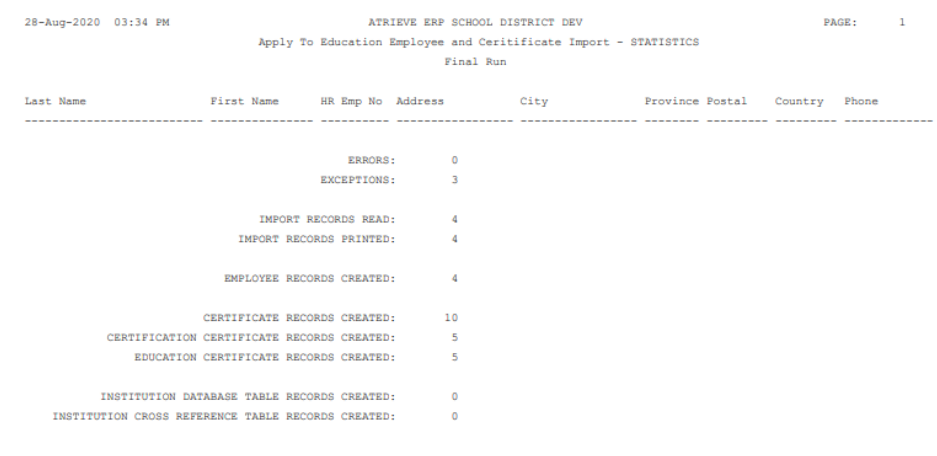 There is also duplicate checking in place for both certification and education records. If the identical information is found in Atrieve HR, records will not be duplicated. You will see the following exception on the report: Found Duplicate Certification Certificate Record, will not ADD To HR.